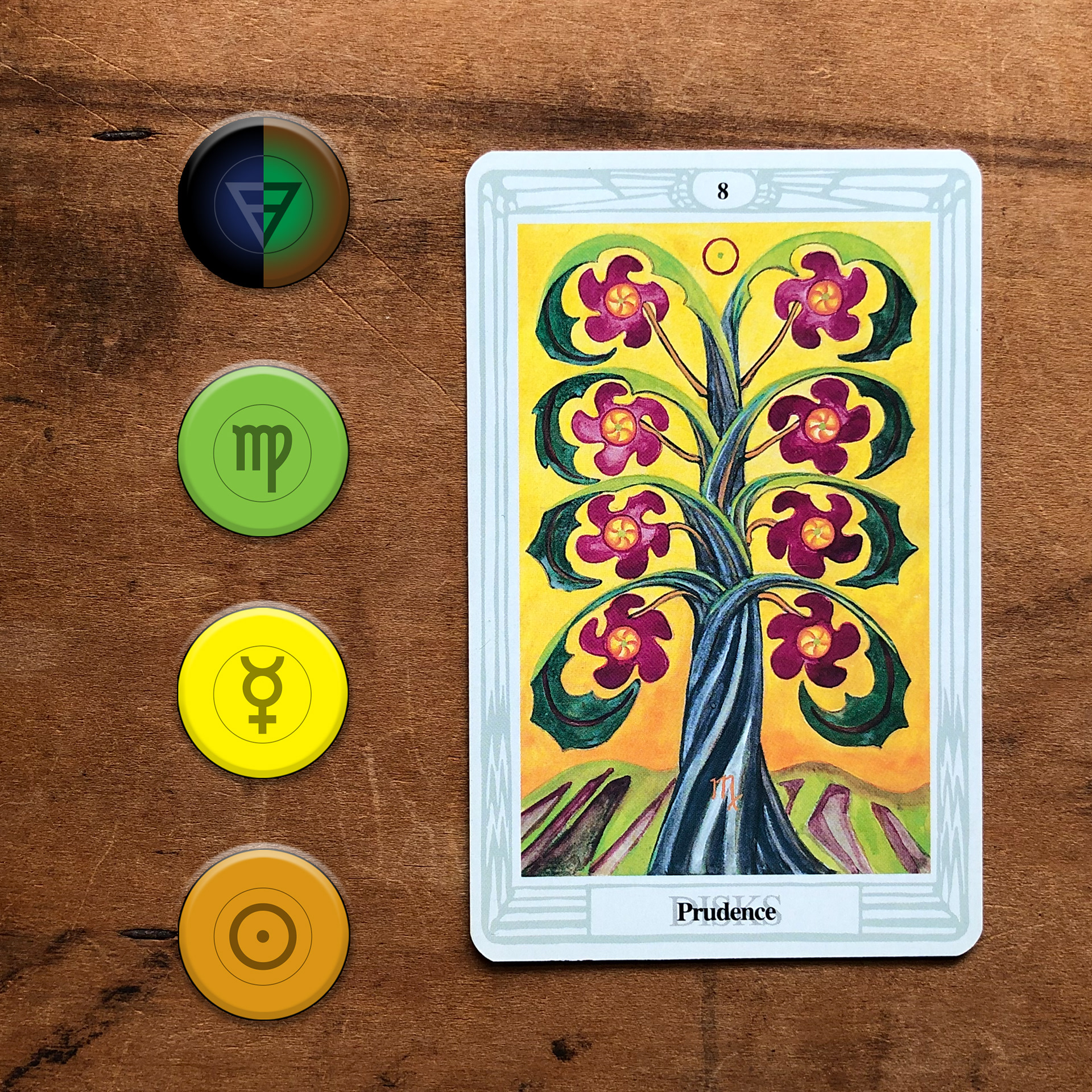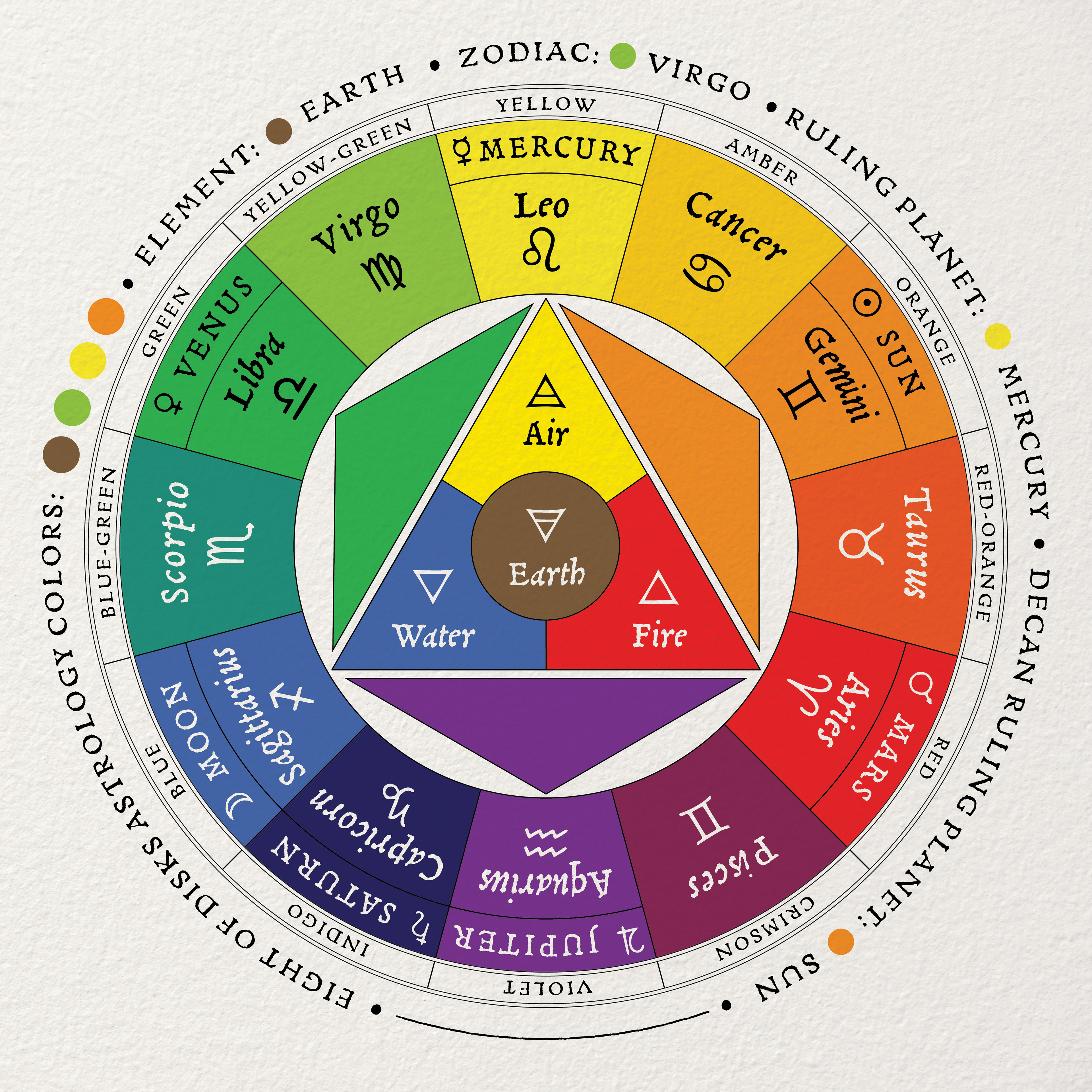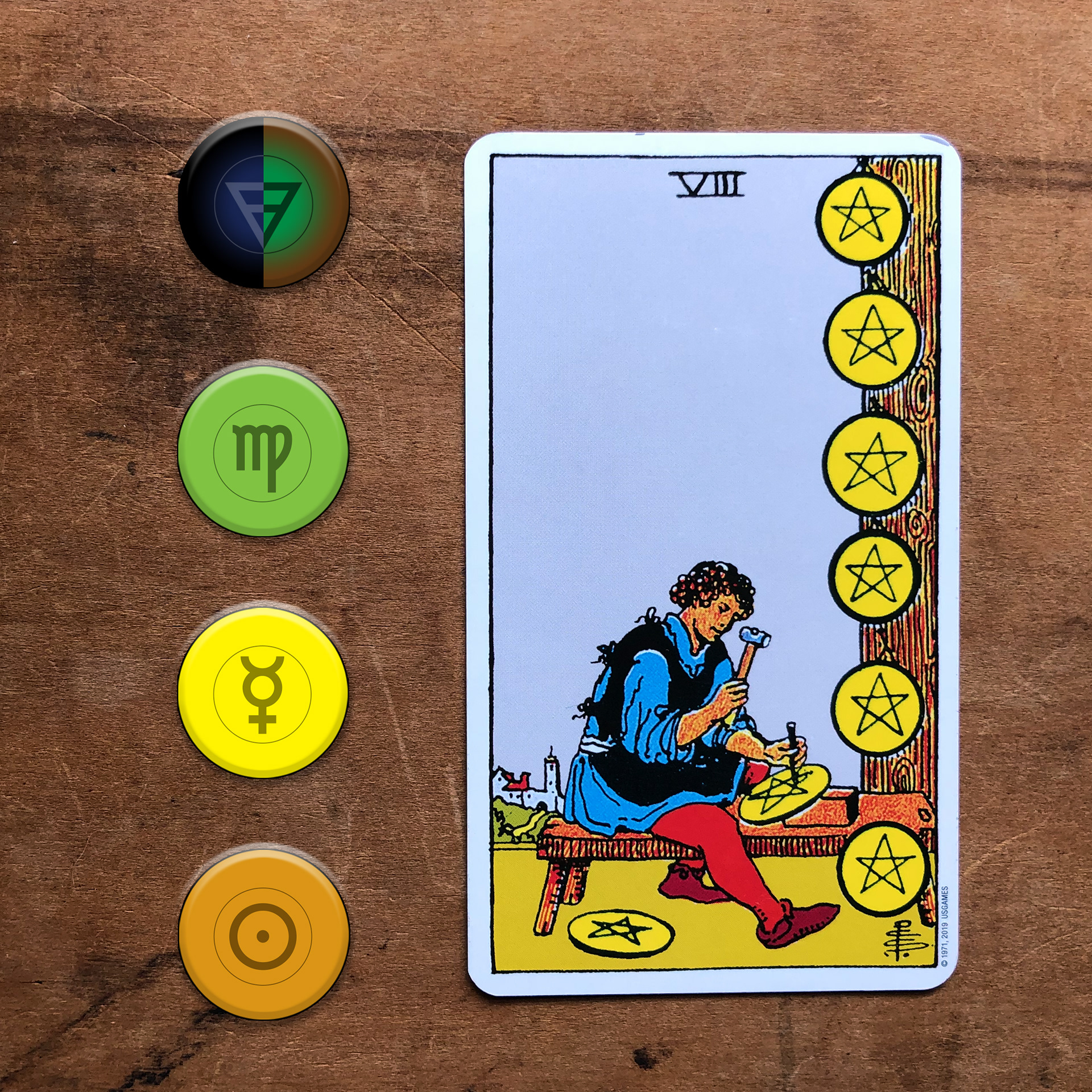 Below is an example of the color wheel applied to the Eight of Disks tarot card, whose Zodiac sign is Virgo, ruling planet is Mercury, and Decan Ruling planet is the Sun.