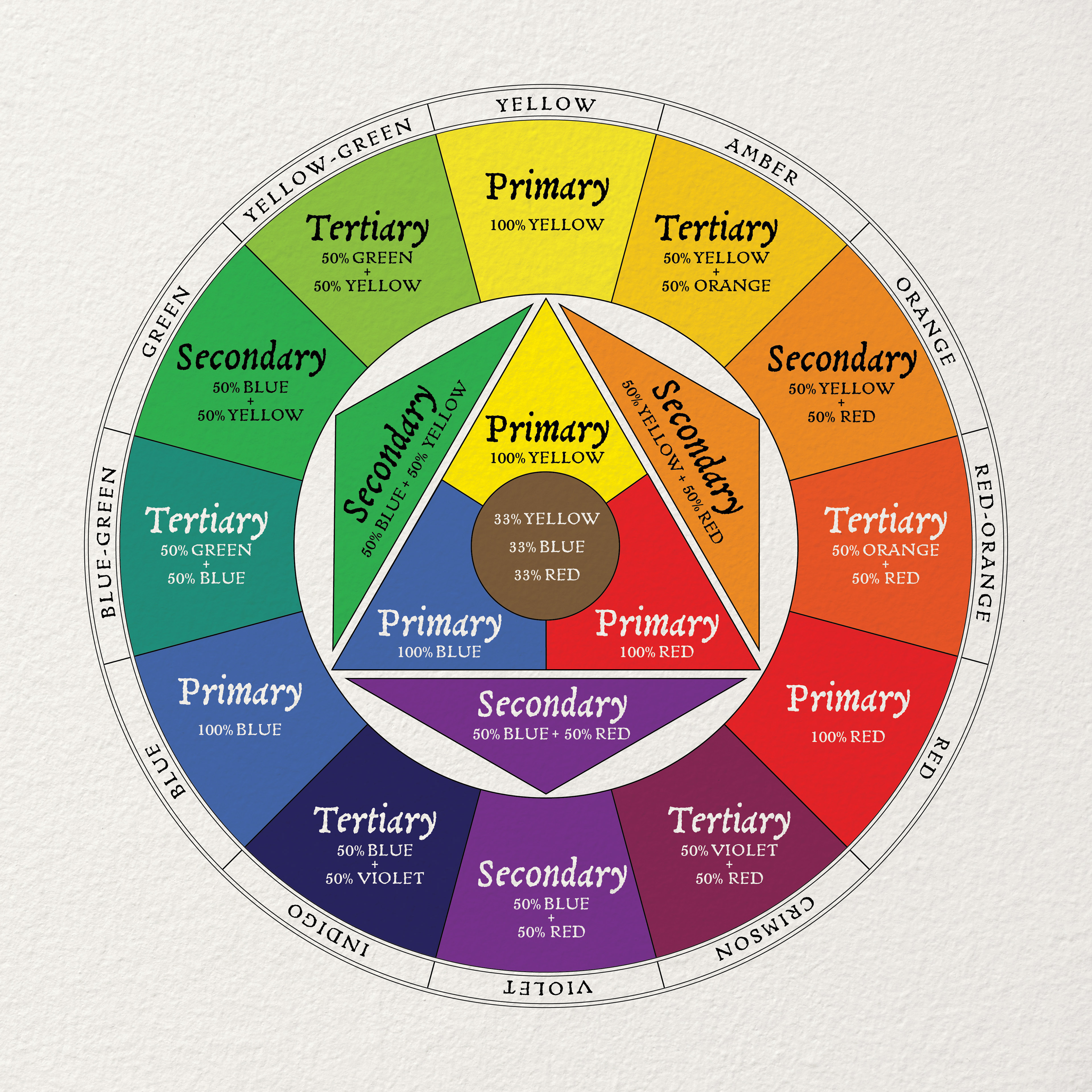 I created my own version of the color wheel for workshops and social media posts intended to educate students of astrology and tarot about the color symbolism in traditional Golden Dawn-based tarot decks. I created several variations of the image, including one as a title, one as a traditional color wheel with mixture percentages, and one adaptable for tarot, showing the color breakdown in the outer text.