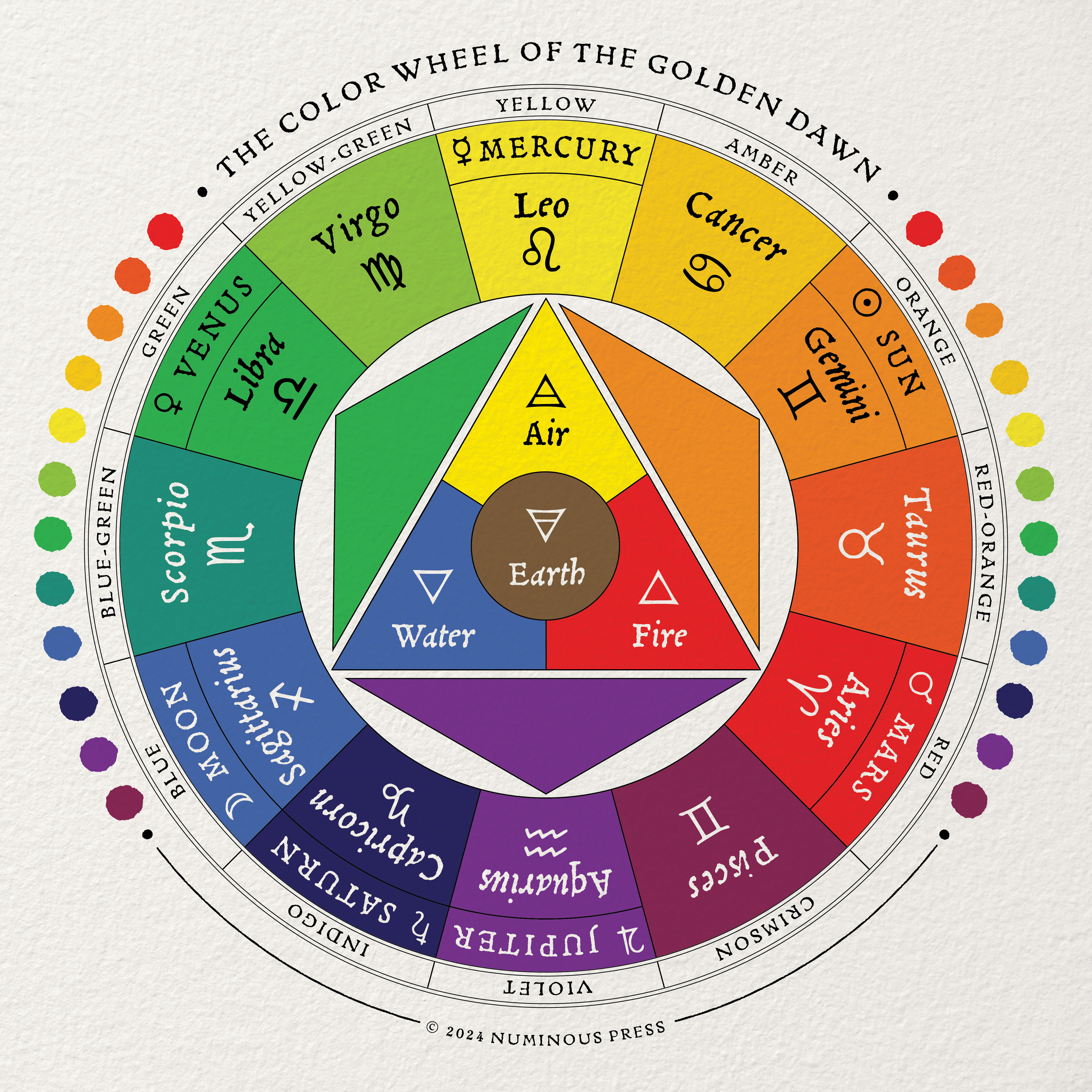 The Color Wheel of the Golden Dawn is a system developed by the esoteric order of the same name to assign colors to the twelve signs of the Zodiac and the seven classical planets. This color system was used within their organization to decorate ceremonial spaces and clothing and to assign colors to the tarot.