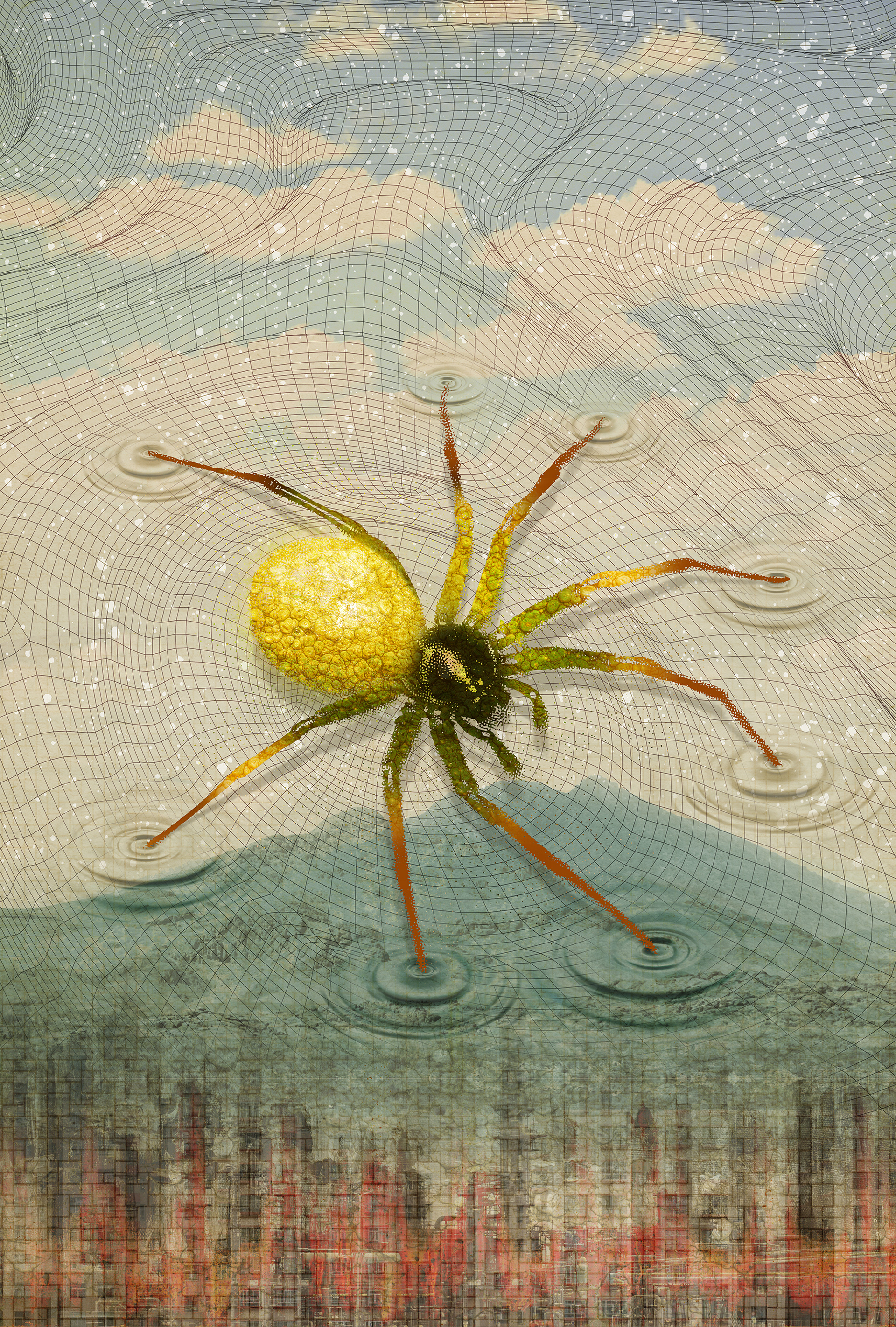 "The imagery for The Heart of the Great Weaving was inspired by a series of synchronicities between Elisa's encounters with spiders, both real and as archetypes, and my reading of Kenneth Grant's Typhonian Trilogy, in which he discusses the occult significance of the spider. Both Elisa and Grant see the spider as a powerful meditation tool. Elisa's request for imagery of a golden spider whose web can manipulate reality immediately reminded me of Grant's description of the spider's legs connecting to different points in time and space. I chose to depict the web as a wireframe of soundwaves, with each of the spider's legs creating its own ripple in reality. To bring it all home, I have a great interdimensional spider hovering over and interacting with our beautiful city in the mountains." ~ HMJ