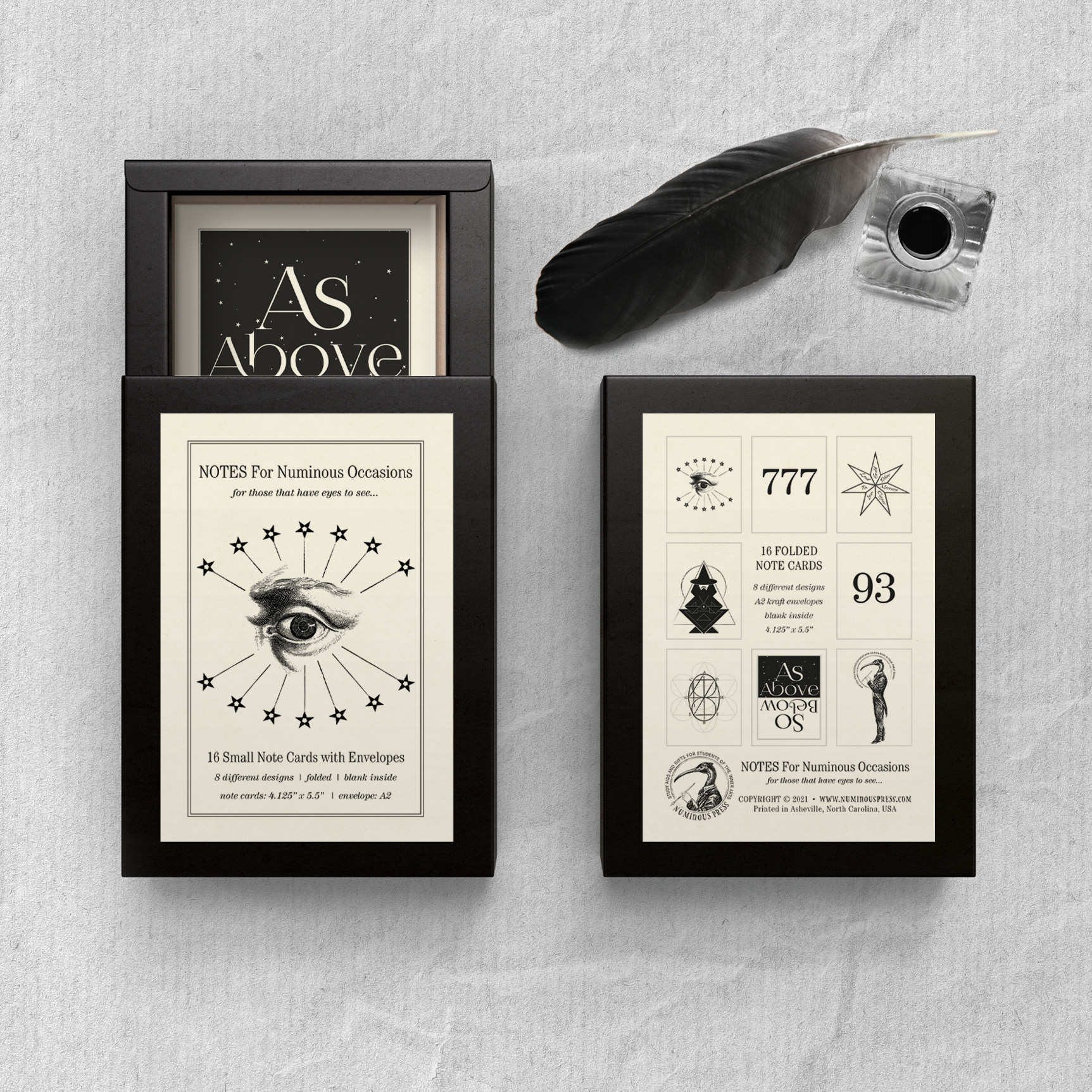 Notes for Numinous Occasions is a set of occult-themed note cards. The folded note cards are blank insideĀ and printed in black ink on uncoatedĀ cover stock paper in a natural warm white shade. Two each of eight designs, along with brown kraft envelopes, are packaged in a glueless, black kraft paper sliding box. This premium set is printed and assembled in our studio. You can purchase this card set from Numinous Press.
